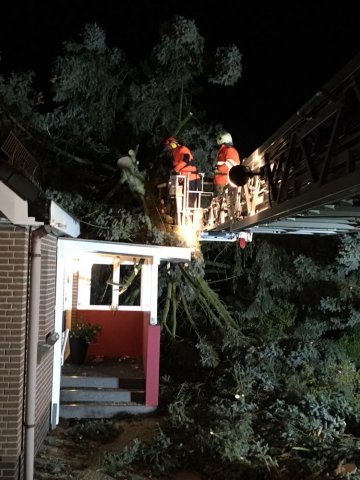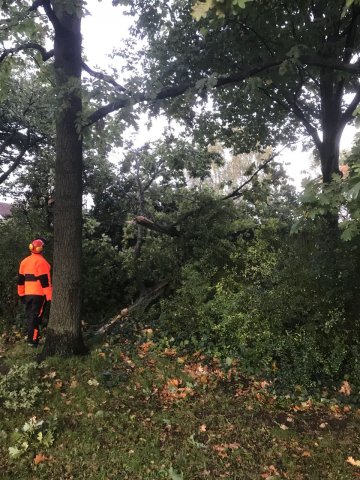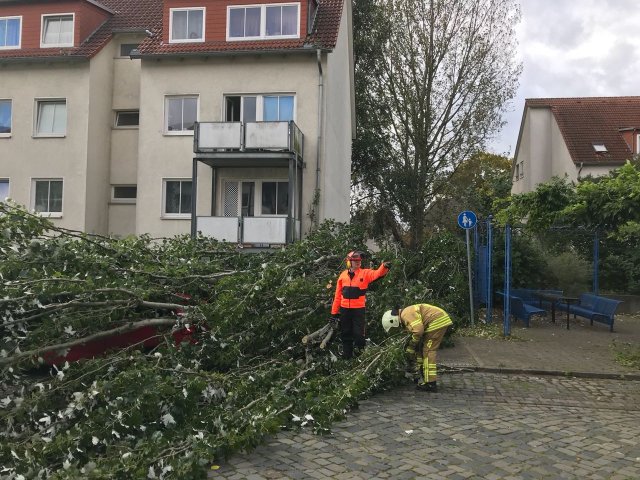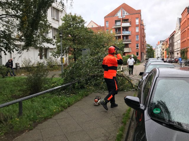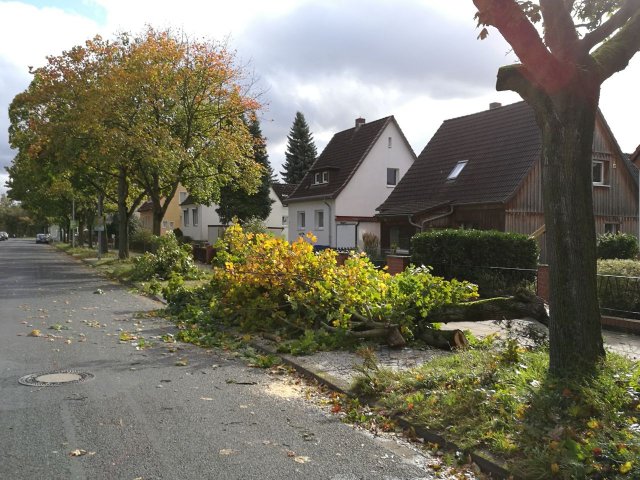 Insgesamt mussten im Stadtgebiet Hannover bis in die Nachtstunden etwa 360 Einsätze abgearbeitet werden. Zum Großteil handelte es sich dabei um abgeknickte Äste, umgestürzte Bäume, welche unter der Last ihres noch vorhandenen Blätterdaches schlichtweg nachgaben, oder Dachziegel die von Hausdächern flogen und eine Gefahr für Passanten dar stellten. Die Ortsfeuerwehr wurde insgesamt zu 30 Einsätzen alarmiert und arbeitete diese mit HLF, LF 20, LF 16 und DL, welche dank unseres abgeschlossenen Hallenbaus ebenfalls schnell einsatzbereit war, ab. Mittels mehrerer Motorkettensägen und ordentlich ‘manpower’, konnten zahlreiche Bäume abgetragen werden und versperrte Verkehrswege, wieder für den öffentlichen Verkehr freigegeben werden.