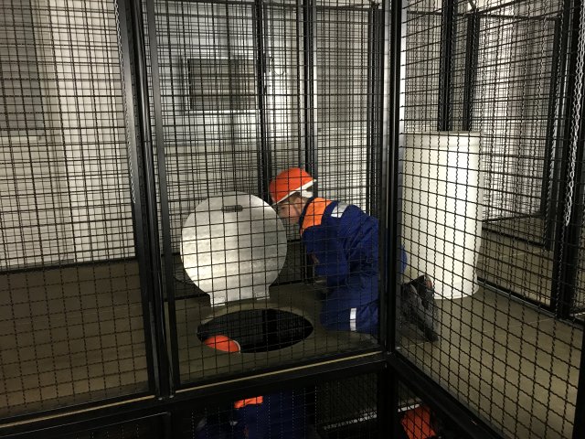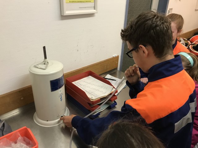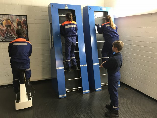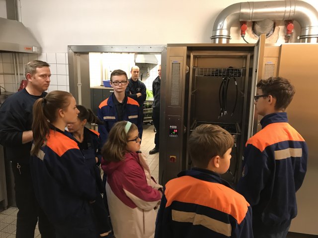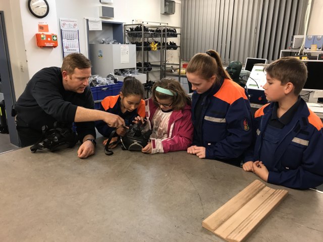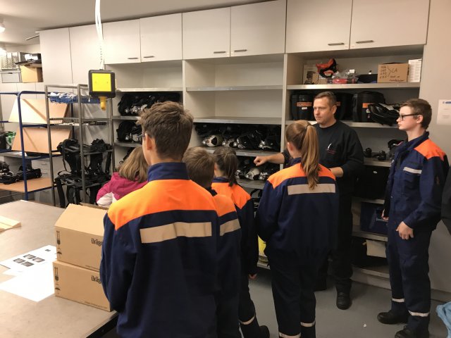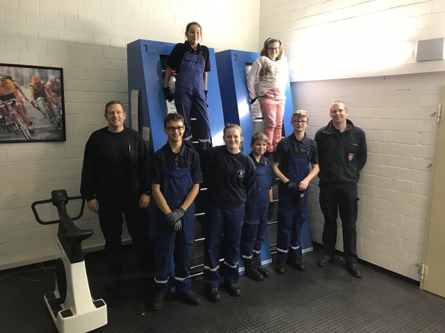 Uns wurden der Aufbau und die verschiedenen Bereiche des Atemschutzzentrums gezeigt und erklärt. Zu den verschiedenen Bereichen zählen unter anderem die „Wäscherei“, wo benutze Atemanschlüsse, Lungenautomaten und Pressluftatmer auseinander gebaut und gereinigt werden. In der angrenzenden Atemschutzwerkstatt werden die gereinigten Bauteile des Pressluftatmers, der Lungenautomaten oder der Atemanschlüsse geprüft und wieder zusammen gebaut. Das Highlight des Abends war für die Jugendlichen der sogenannte „Streckendurchgang. Alle durften zweimal durch die Atemschutzübungsstrecke, wobei es beim zweiten Durchgang galt den Gitterparcours ohne eingeschaltete Beleuchtung zu absolvieren. Im Anschluss hieß es dann, Leiter steigen! Etwa 20 m mussten die Kids auf der Endlosleiter bewältigen.