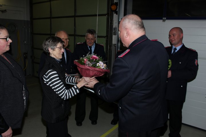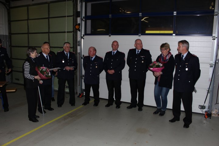 Friedrich Ladage, Mitglied der Altersabteilung, eingetreten 1967, wurde mit der goldenen Ehrennadel für 50. Jahre treue Mitgliedschaft geehrt. Holger Ladage, 1977 eingetreten in die Jugendfeuerwehr und ebenfalls Mitglied der Altersabteilung, wurde mit der silbernen Ehrennadel für 40. Jahre Mitgliedschaft geehrt. Aus den Reihen der Einsatzabteilung wurde der 1992 eingetretene Helgo Funke mit der silbernen Ehrennadel für seine 25-jährige Mitgliedschaft geehrt. Natürlich erhielten auch die Lebenspartner der Geehrten ein kleines Präsent in Form eines Blumenstraußes.