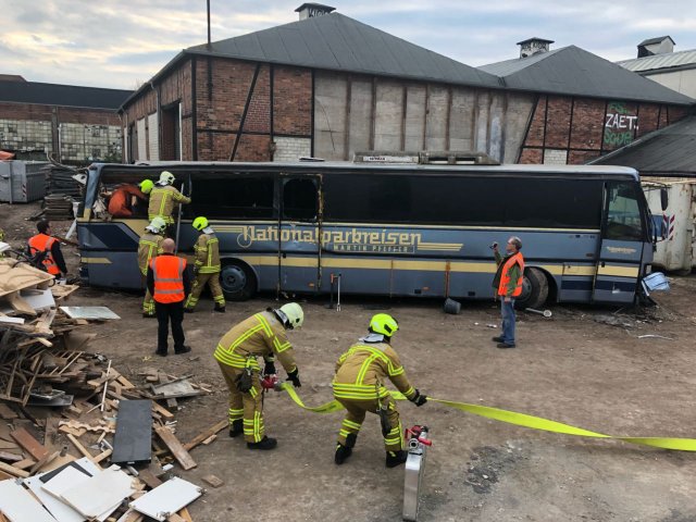 Dieser befand sich im Entenfangweg im Stadtteil Ledeburg. Kurz nachdem Eintreffen alarmierte die Übungsleitstelle den MTW zu einem Busunfall mit unklarer Lage. Nach der Lageerkundung gab der Zugführer eine kurze Rückmeldung an die Übungsleitstelle, welche dann unsere beiden Löschfahrzeuge mit dem Alarmstichwort „hm2“ (Personen eingeklemmt Groß) nachalarmierte, da mehrere Personen im Bus eingeklemmt waren. Am Einsatzort eingetroffen übernahm die Besatzung des HLF 20 die technische Rettung der eingeklemmten Personen. Die Besatzung des LF 16/12 baute einen zweiteiligen Löschangriff auf und unterstütze im Anschluss bei der technischen Rettung. Schnell konnte mittels hydraulischen Rettungsgerätes ein Zugang zu den eingeklemmten Personen geschaffen werden.Nach der Befreiung der Personen wurden diese schonend mittels „Spineboard“ aus dem Bus zur Verletztenablage gebracht. Durch die hohe Anzahl an verletzten Personen wurde zwischenzeitlich die Alarmstufe ManV1 (Massenanfall von Verletzten Stufe 1) fiktiv ausgelöst.
