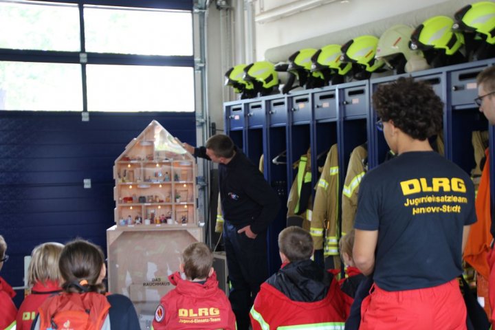 Für die jungen Wasserretter ging es zunächst mit einer theoretischen Einheit los. Unsere Kameraden Jasmin Funke und Oliver Taubmann erklärten dabei die Organisation und Aufgaben der Feuerwehren in Hannover und bei der Ortsfeuerwehr Vinnhorst im Speziellen. Auch ein wenig Praxis mit den Themen “persönliche Schutzausrüstung” und “der Notruf” war dabei. Kurz danach konnten die Jugendlichen und Kinder die schnelle Rauchausbreitung in einem Wohnhaus begutachten, die im so gennanten „Rauchhaus“ dargestellt werden konnte. Nachdem alle einen guten Wissensvorsprung hatten, ging es in die Stationsarbeit über.