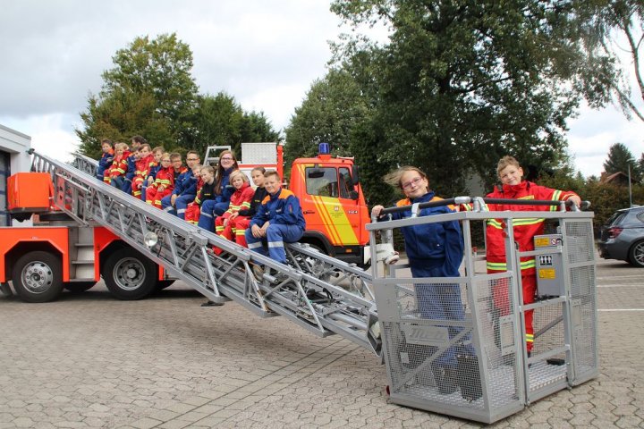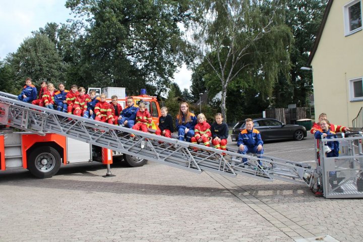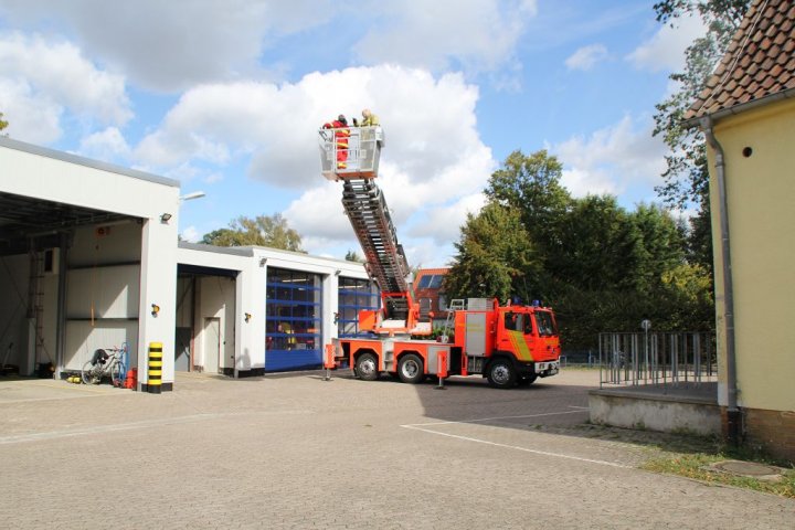 Geübt wurde ein Löschangriff, bei dem das Ziel war, einen Hydranten zu suchen und mit Hilfe einiger Mitglieder unserer Jugendfeuerwehr eine Wasserversorgung herzustellen. Auch der Löschangriff mit einem Strahlrohr wurde aufgebaut, um einen Brand zu bekämpfen. Der Brand wurde dabei mit Hütchen dargestellt. Das Hilfeleistungslöschgruppenfahrzeug (HLF) 20 wurde von allen mit großem Staunen besichtigt und bewundert. Auch unsere Drehleiter nahmen wir in Stellung und zeigten unseren Stadtteil von oben. Am Ende gab es ein Abschlussfoto als Erinnerung, bei dem sich alle auf der Drehleiter von ihrer guten Seite zeigen konnten. Zu guter Letzt möchten wir uns bei der DLRG für die sehr gute Zusammenarbeit bedanken, egal ob bei einer Übung oder im Einsatz und freuen uns auf weitere Begegnungen.