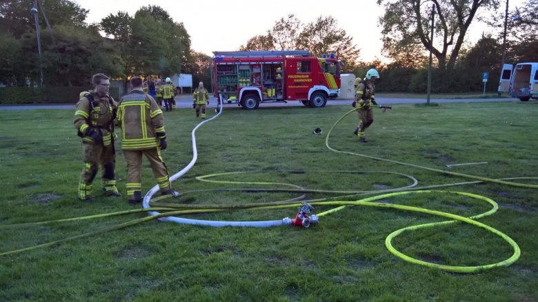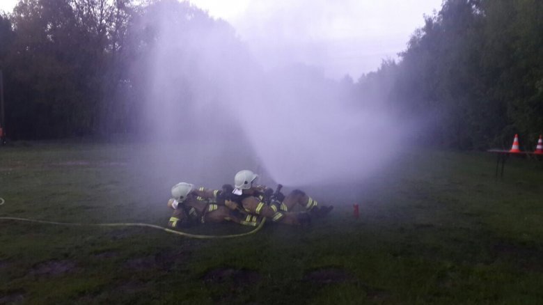 Hier wurde ein Innenangriff simuliert, bei dem die richtige Handhabung eines Hohlstrahlrohres besonders wichtig ist. Dazu gehört die richtige Einstellung des Wasserstrahls und die abzugebende Wassermenge. Sehr wichtig ist der sogenannte "Mann-Schutz". Diese Einstellung bildet eine feine Wasserwand vor dem vorgehenden Trupp und schützt ihn so vor einer plötzlichen Rauchgasdurchzündung. Um von der Flammenwand möglichst nicht erfasst zu werden, muss sich der Trupp dabei ruckartig zurückfallen lassen.
